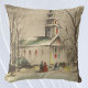 illustratie Victoriaans kerstvakantieontwerp met een kerk in een winterlandschap met bomen. Er is sneeuw op de grond en parochianen komen naar de diensten. Mooie antiek tinten met heldere kleuren van rood en groen in de ramen.