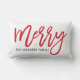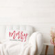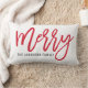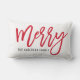 Een moderne witte lendenkussen met oversized "Merry" in vet rood penseelschrift met een familienaam in schone hoofdletters eronder. De opvallende handlettertypografie creëert een frisse, eigentijdse kerstaccent dat opvalt op banken, bankjes en kerstbeddengoed. Personaliseer met uw familienaam voor een betekenisvol seizoensgeschenk of kerstcadeau.
