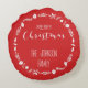 Rode kerst-ronde kussen met witte bladeren decoratie en verwisselbare tekst - u kunt uw familienaam toevoegen, gedrukt op rode achtergrond