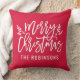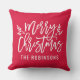 Een stevige rode kussensloop met oversized "Prettig Kerstfeest" in witte borstelscript met delicate hulstbes takjes en een familienaam eronder. De levendige rode achtergrond en knappe witte letters creëren een vrolijke, opvallende Kerstmis-boodschap. Personaliseer met uw familienaam voor een feestelijke Kerst-accent of cadeau. Een uitstekend stuk voor Kerst-bankstellen, fauteuils en seizoensbijeenkomsten.