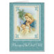 Prachtig traditioneel afbeelding van de Heilige Maagd Maria dat de Baby in een kribbe aanbidt. Een rozenkrans hangt boven de kribbe in een groene tak. Alle teksten en lettertypen kunnen worden aangepast.