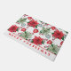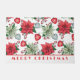 Er zijn mooie hulstbessen, rode en groene poinsettias en hartvormige ornamenten met sneeuwvlokken erop.