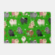 Kute kersthonden in feestelijke vakantieoorden. Pommeren met crème, zwarte, geelbruine, grijze en chocoladejassen draag kerstmantels, geweien, zweet op een groene achtergrond met versnipperde versieringen.