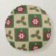 Vier vierkantjes in groen en bruin zijn voorzien van rode versieringen met witte sneeuwvlokken en groene holly met rode bessen. White stitching voegt een decoratieve aanraking toe, waardoor het herhalingspatroon het uiterlijk van een quilt geeft, wat een perfect gezellig gevoel creëert voor de kerstvakantie.