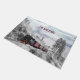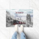 Een gepersonaliseerde deurmat met een foto van een ijzig winterlandschap met besneeuwde dennenbomen. Een rode, gouden en zwarte ouderwetse trein die door het winterwonderland rijdt.