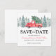 Rustieke wintertrouwkaartjes met een eenvoudige witte achtergrond, watercolor kerstboomtakken, een vintage rode truck, een kerstboom en een traditionele 'save the date' template die makkelijk te personaliseren is.