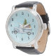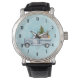 Een horloge met een feestelijk vakantieontwerp. Een vrachtwagen met kerstpijnbomen en enkele bosdieren. Een beer, een vos en een hert die achterin staan en een ritje maken. Ontwerp gemaakt met waterverven.