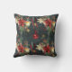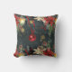 Een kerstwintervakantie decor gooi kussen met een bos bos winter 's nachts achtergrond met glinsterende gouden sneeuwvlokken, poinsettia's, lantaarns, dennenappels en rode bessen met een rode bal ornament op rode lint vallen. De voor- en achterzijde zijn verschillend geslepen.