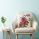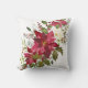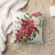 Kerstkussen hebben waterverf poinsettias, holly bladeren en bessen diagonaal aan de voorzijde. De achterkant van de kussen heeft een rode achtergrond met een dun wit vlechtvormig patroon.