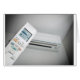 Afstandsbediening met twee opties voor energiebron en met een apparaat voor luchtconditie op de achtergrond.
