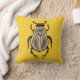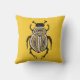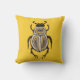 Abstract keverkussen met een inktillustratie die een cartoon abstract kever met decoratieve elementen in wit, goud en zwart op een intens gele achtergrond afbeeldt.