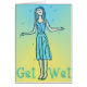 Vrouw geniet van het eenvoudige genoegen in de regen te staan. Met de hand geijkte stempelvormgeving omgezet in elektronische kunst op basis van het gezegde van Sark