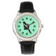 Grafische afbeelding van een zwarte kat in het midden, met pootafdrukken op de vijf minuten posities. Pas de achtergrondkleur aan naar uw wens.