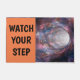 Deze grappige welkome mat waarschuwt gasten om "Uw Stap te zien" en te voorkomen dat ze in het zwarte gat vallen.