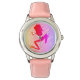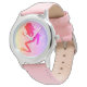 Het heldere kikkerwerk op dit horloge is gemaakt van een originele foto van een kleine kikker die een glazen raam klimt. De kikker is rood in paars, dan blauw. De achtergrond is pastelgeel, verschuivend naar roze, dan lichtblauw.