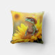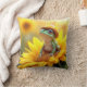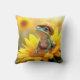 Een kikker met een klein pet zit bovenop een felgele zonnebloem, omringd door een wazige achtergrond van vergelijkbare bloemen