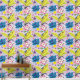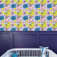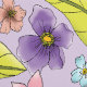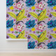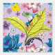 Een schattige rode ogige boomkikker op drie bladeren tegen een achtergrond van licht paarse en bloeiende bloemen