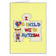 Een groot die raadselstuk, een hart uit raadselstukken wordt samengesteld, een donkerbruin haired meisje van het stokcijfer, en tekst die de "Liefde van I een Kind met Autisme" op de T-shirts van de autismevoorlichting, mokken, kaarten, stickers, bolsazakken, magneten, sleutelhanger, dagboeken, muismat, en andere kleding en giftpunten leest.