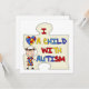 Een groot die raadselstuk, een hart uit raadselstukken wordt samengesteld, een donkerbruin haired meisje van het stokcijfer, en tekst die de "Liefde van I een Kind met Autisme" op de T-shirts van de autismevoorlichting, mokken, kaarten, stickers, bolsazakken, magneten, sleutelhanger, dagboeken, muismat, en andere kleding en giftpunten leest.