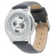Voetbal sport thema, gepersonaliseerd horloge voor kinderen- Centre is een voetbal op grijs, geborsteld metaal, zilveren look achtergrond. Faux metallic zilveren klok gezicht nummers. Douanenaam in zwarte, atletische stijl belettering vertoning op bal. De kleur en de stijl van het monogram kunnen worden veranderd. Leuk, gepersonaliseerd cadeau voor kleine atleten of voetbalfans. Dit op maat gemaakte voetbalhorloge is verkrijgbaar in verschillende kleuren van horlogebanden en op veel kinder horlogestijlen, zowel jongens als meisjes, evenals voetbalhorloges voor volwassenen.
