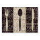 © Pela Studio / Wild Apple. Een zwart-wit afbeelding van een vork, lepel en mes. Op de achtergrond staan woorden geschreven.