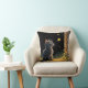 Een zwart kitten kijkt omhoog naar zachtjes vallende gele bladeren tegen een achtergrond van een bakstenen muur