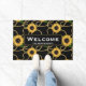 Welkom deurmat met een elegant en stijlvol patroon. gele zonnebloemen en groene bladeren omgeven door delicate gouden kettingen. Zwarte achtergrond. Een zwarte rechthoek met een goudkleurige rand met daarin uw gepersonaliseerde tekst.