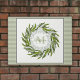 Klassieke Elegant Style Greenery Wreath gepersonaliseerd met monogram en naam. Sage groene streep achtergrond. Perfecte bruiloft of huisopwarmingscadeau. Sage, crème, donkergroen kleurenpalet.