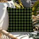 Vun en schattig buitenshuis gooien kussen met klassiek zwart en groen gevlekt vlechtvormig patroon op de achtergrond van de schoot. Stijlvol rustig, uniek decor-accent buitenshuis voor het versieren van de voorste veranda of tuin van uw landhuis, blokhut, bergkam, viskamp, meer- of riviervakantiehuis.