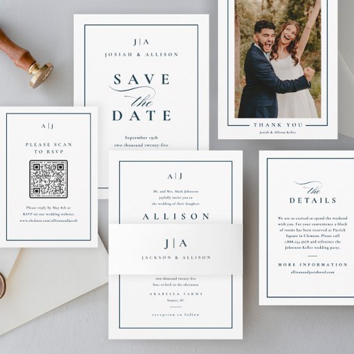 Klassieke Monogram Marine Blue Wedding Save the Da Vellum Uitnodigingen