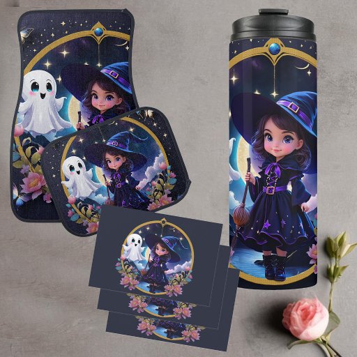 Kleine heks met grote, sprankelende ogen. Naast haar zweeft een schattige geest die er vriendelijk uitziet en een speelse uitstraling heeft. Het ontwerp geeft een gevoel van vriendschap en magie