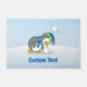 Een kleine pinguïn cartoon die buigt om een sneeuwbal te krijgen die een andere vermijdt. Aangepaste tekst.