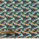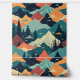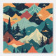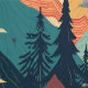 Deze prachtige afbeelding toont een gestileerd berglandschap met levendige toppen in de kleuren blauwgroen, sinaasappel en geel. Pijnbomen stippen op de voorgrond, terwijl wolken over de ruggen zweven, waardoor een dynamisch en grillig tafereel ontstaat dat doet denken aan een abstract natuur schilderij.