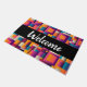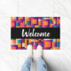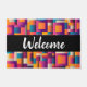 Welkom deurmat met een kleurrijke abstracte achtergrond. Vette en spannende kleuren - roze, blauw, oranje en meer.