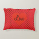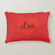 Laat je liefde zien met dit speelse accentkussen. Er is een rode achtergrond met zwarte stippen. In het midden van het kussen is een rood hart, met het woord Liefde.