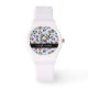 Kleurrijke bloemen, blauwe achtergrond, zwart horloge