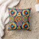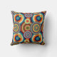Dit kussen heeft een Bauhaus-ontwerp van verschillende groepen concentrische cirkels in de kleuren van de jaren zeventig.