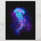 Grote, blauwe, artistiek getekende, gloeiende, heldere kwal, met lange tentakels op een zwarte achtergrond met paarse bioluminescentie. Lichtgevende kwal.