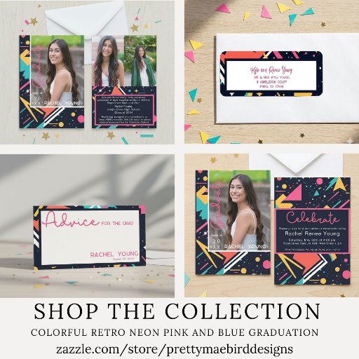 Stap in de bruisende wereld van de jaren 80 met onze retro-geïnspireerde afstuderen aankondigingsuitnodiging! Tegen een achtergrond van diep marineblauw vormen uitbarstingen van neonroze, elektrisch blauw en limoengroen abstracte vormen die doen denken aan de iconische esthetiek van het tijdperk. Voor en in het midden legt een gekoesterde foto de essentie van uw prestatie vast, die trots en prestatie uitstraalt. Draai de uitnodiging om nog twee momentopnamen te ontdekken en laat zo de reis zien die tot deze gedenkwaardige gebeurtenis heeft geleid. Te midden van de levendige tinten wenkt ons uitnodigingsbericht: