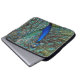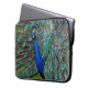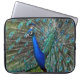 Kleurrijke mannetjespauw die zijn staartveren veeghoes van laptophoes steekt