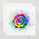 Grote, bloeiende roos met regenboogkleurige bloembladeren op witte achtergrond, beschilderd met spetters van kleurrijke, heldere verf. 3d
