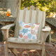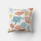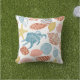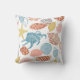 Dit strandachtige zomerse buitenkussen heeft een patroon van kleurrijke schelpen in tinten blauw, blauwgroen en koraal, op een witte achtergrond.