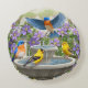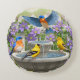 Blauwvogels en goudvinken genieten van een fonteingeborene in een kleurrijke bloementuin van paarse clematis, die zich vastklampt aan een witte hek, en de gele en blauwe maissoorten hieronder. Kunstwerk van de wildstand en de paardenkunstenaar Crista S. Forest.