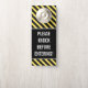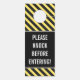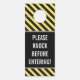 Dit ontwerp is voorzien van het bericht "Klop alsjeblieft voordat je binnenkomt!" in vetgedrukte witte tekst, samen met geel en zwart gekleurde waarschuwingsstrepen.
