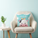 Stomme gooi kussen voor de kwekerij met een gele vlinder op het hoofd van een witte en zwarte koe. Personaliseer met de naam van uw baby in een wit manuscript. Op de achterzijde staan houtskool en witte strepen.