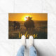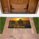 Deze warme en uitnodigende Welcome deurmat heeft een afbeelding van een koe en twee kalveren staan achter een prikkeldraad hek op de prairies van Alberta met de ondergaande zon gloeien achter de koe silhouetten. Het woord "Welcome" is onderaan gedrukt in een goudgele kleur.