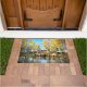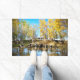 Deze deurmat heeft felle contrasterende kleuren in een herfstblaadje van zwart-witte Holstein-koeien bij het wateringsgat eronder en tussen een afbeelding van geel-, goud-, groen- en oranje bladeren.