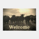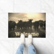 Deze sepia getinte Welcome deurmat heeft een afbeelding van zwart-witte koeien in een weiland met een felle zon achter zich.