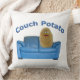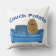 Een grappig aardappelpersonage op een blauwe bank met de tekst van Couch Potato gooit een kussen voor hen die graag naar buiten komen.
