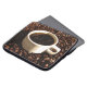 Deze laptophoes toont een witte demitasse-beker van versgezoete koffie die op een bed van donkerbruine gebrande koffiebonen is geplaatst.